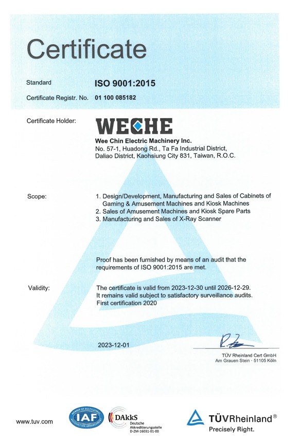 By striving every effort of research and development with all the advanced equipments of precision metal working, die making, wood working, finishing, assembly, testing,etc., Wee Chin Electric Machinery Inc. (WeChe) is inevitably able to provide one-stop solution for all kinds of industries, such as gaming, amusement, self-service kiosk, metal housing, vending machine, and X-ray scanner machine since 1980.