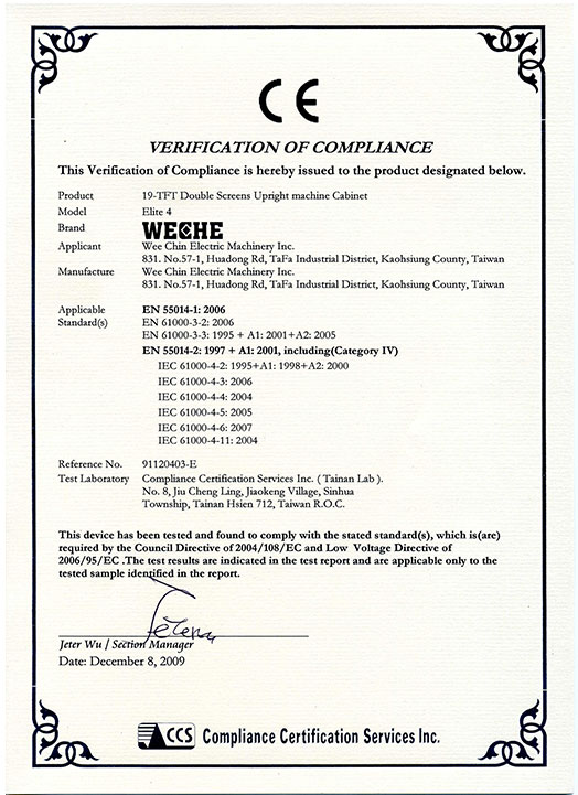 WECHE has been certified ISO 9001 Qaulity System since 2000 and has been constantly compling with this system in management and quality control. In 2010, one of our casino cabinet passed CE Certification. In 2014, we have the gaming cabinet associated with our client for GLI approval. Furthermore, our Crane & Gift Machines has passed EMC Certification as well as our Air Hokey Table Machine has passed CE and UL Certification in 2016.